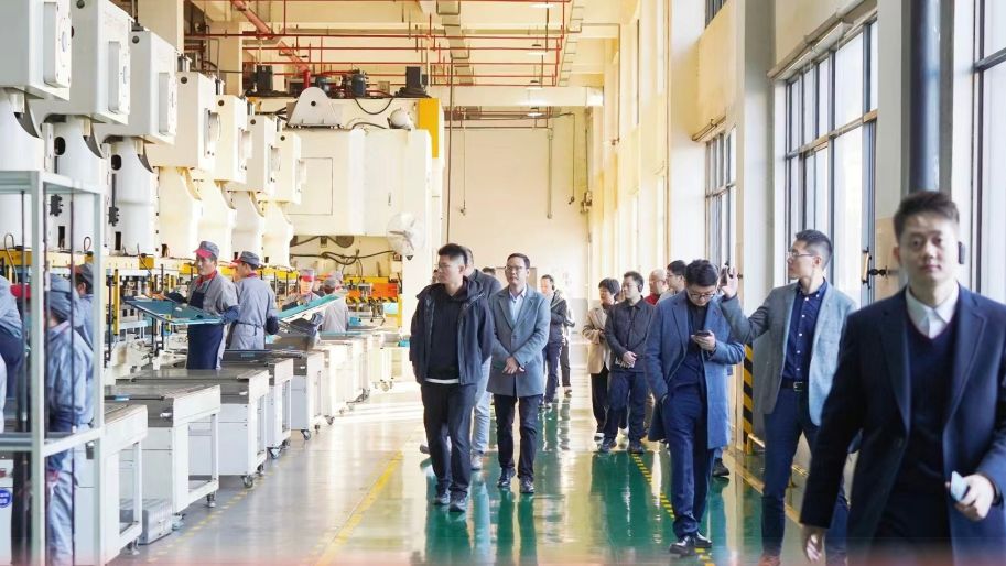 活动伊始,陈盛东陪同学院校友会一行实地参观德意园区,重点参观了德意江南慧谷园区沙盘、德意厨电产品展厅以及德意智家5G智能工厂。参观过程中,陈盛东与园区技术人员为大家详细介绍了德意园区的规划理念、产业定位及智能制造成果,校友代表们对德意集团的产业氛围、经营理念和智造实力均给予了高度评价。