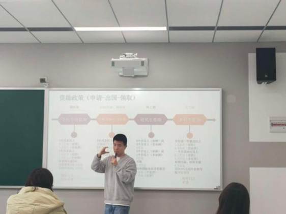 随后,学院学工办周峰老师还重点介绍了学工部为本科生提供的出国(境)学习资助、雅思考试奖学金政策,以及暑期将开展的新加坡优秀青年领袖项目。